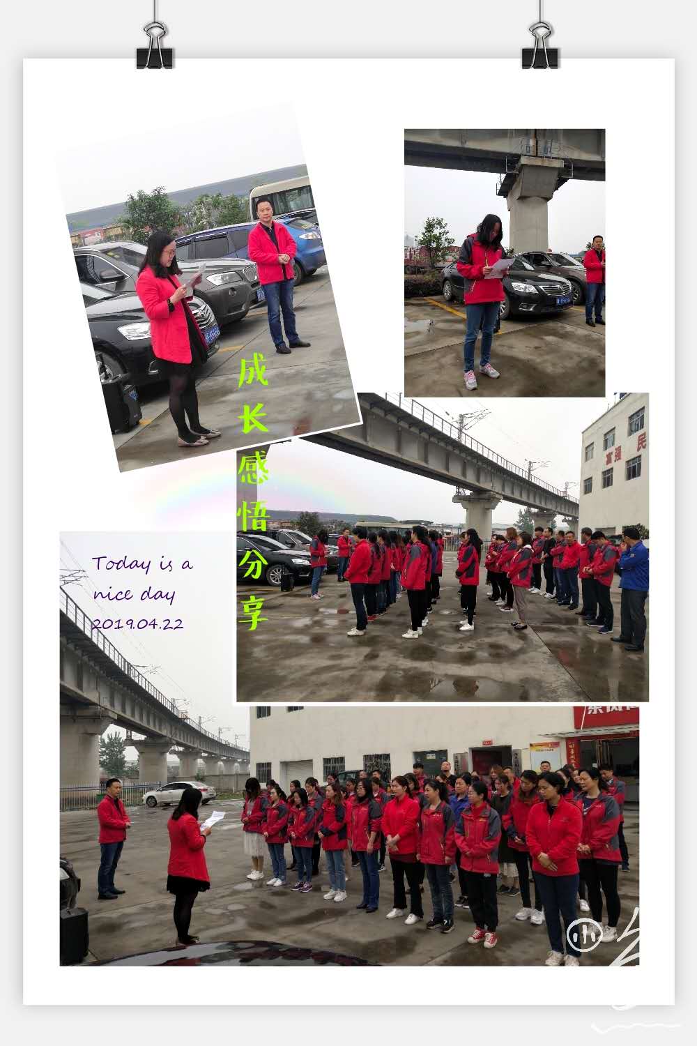 在4月份落實公司下發(fā)的《關(guān)于增強“傳幫帶”企業(yè)文化的通知》中,有王麗、陳婷婷、張媛3名工齡增長的員工和胡艷麗、張瑩2名轉(zhuǎn)正員工參與到這項工作中來,其中王麗、胡艷麗2位員工在4月22日晨會上與大家共同分享了自己的成長歷程、工作經(jīng)驗和轉(zhuǎn)正感想。經(jīng)過評審,物流公司胡艷麗與大家分享的轉(zhuǎn)正感想,感悟透徹,值得我們大家學習,根據(jù)文件規(guī)定對胡艷麗獎勵50元,獎金在2019年4月份工資中發(fā)放。
